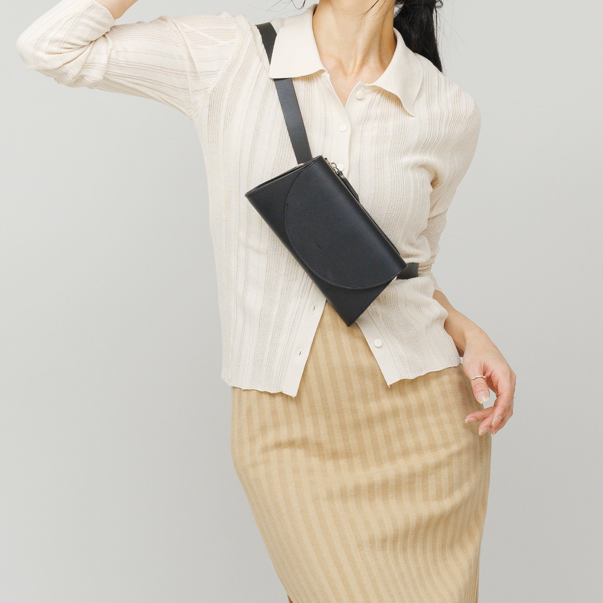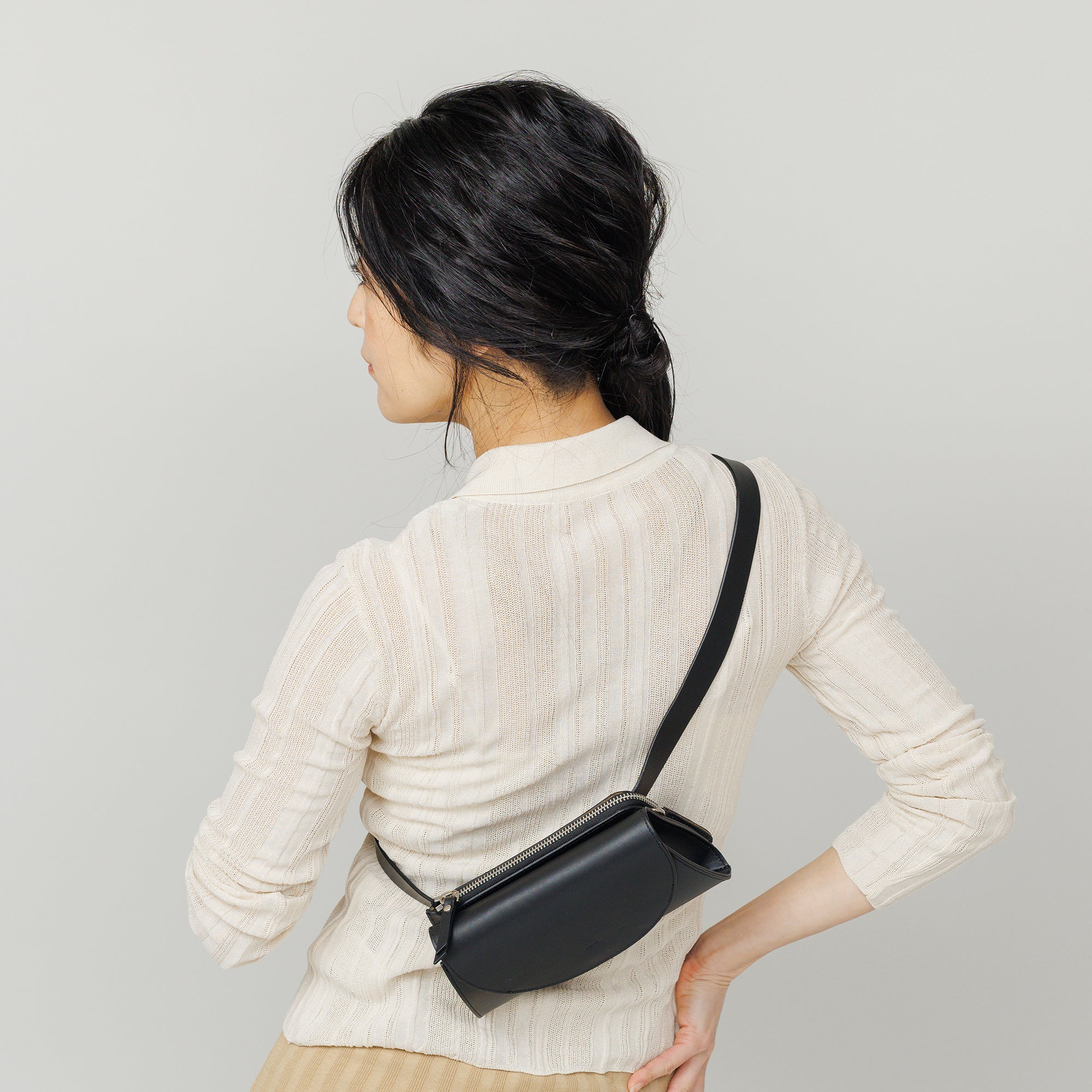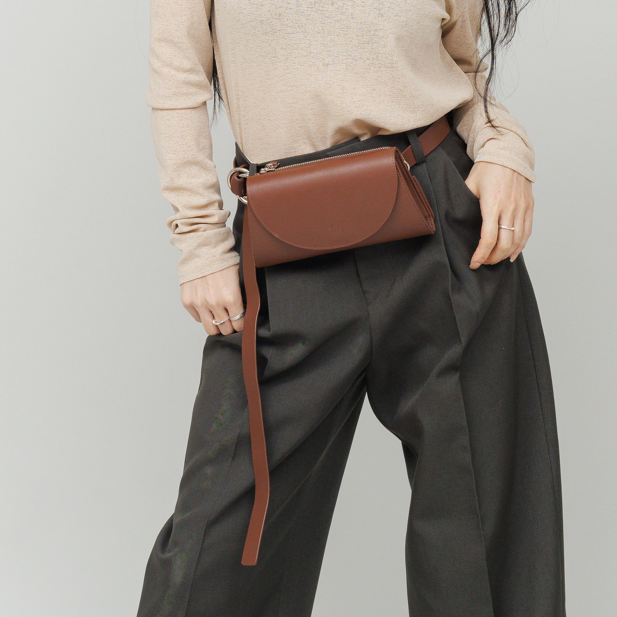 短く斜め掛けにしてのボディバッグはもちろん、腰に巻いてウエストバッグにもなるユーティリティ性が魅力。