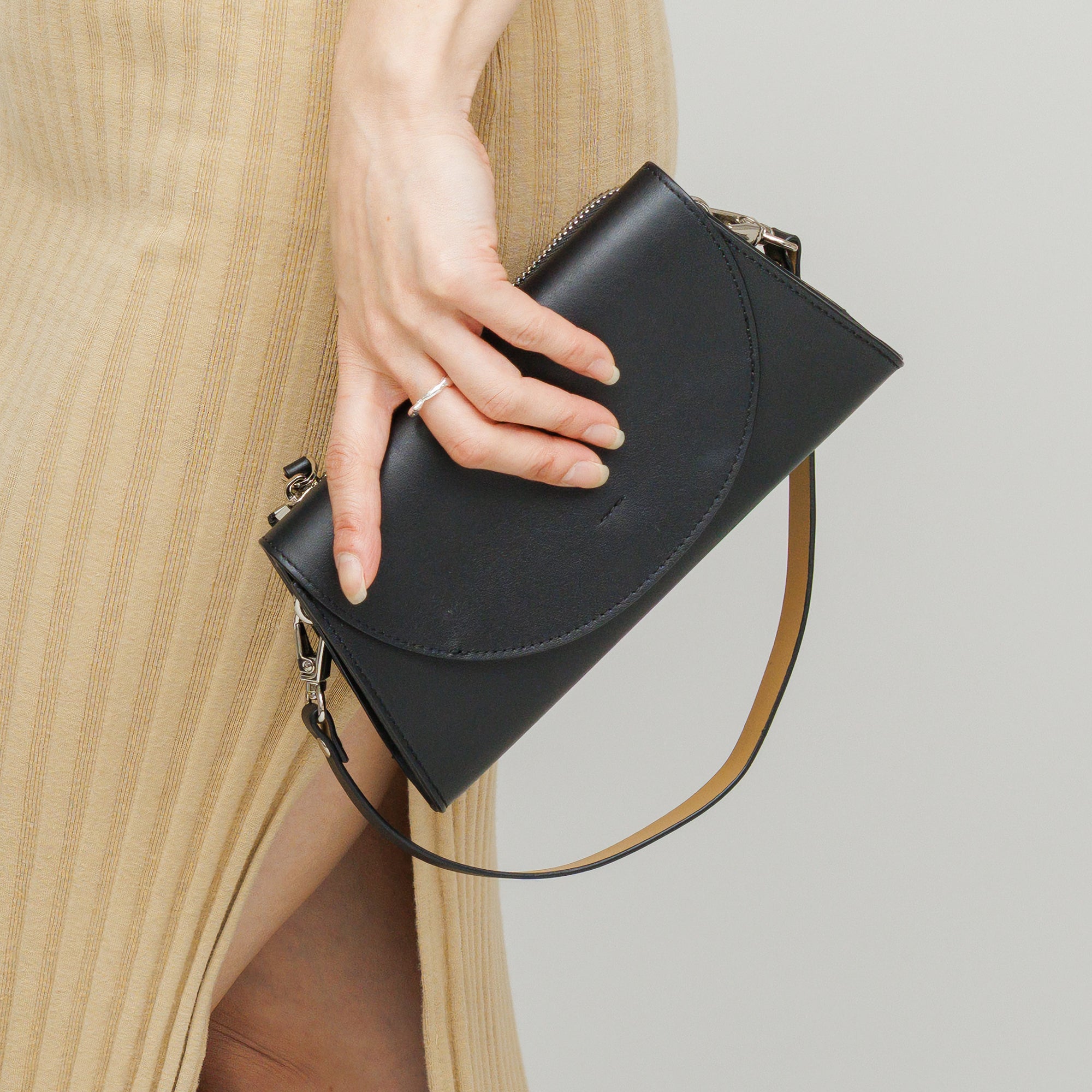 付属のショートストラップでオケージョンにも対応。また、リストストラップにも出来るので抜け感のあるこなれたコーデも。
