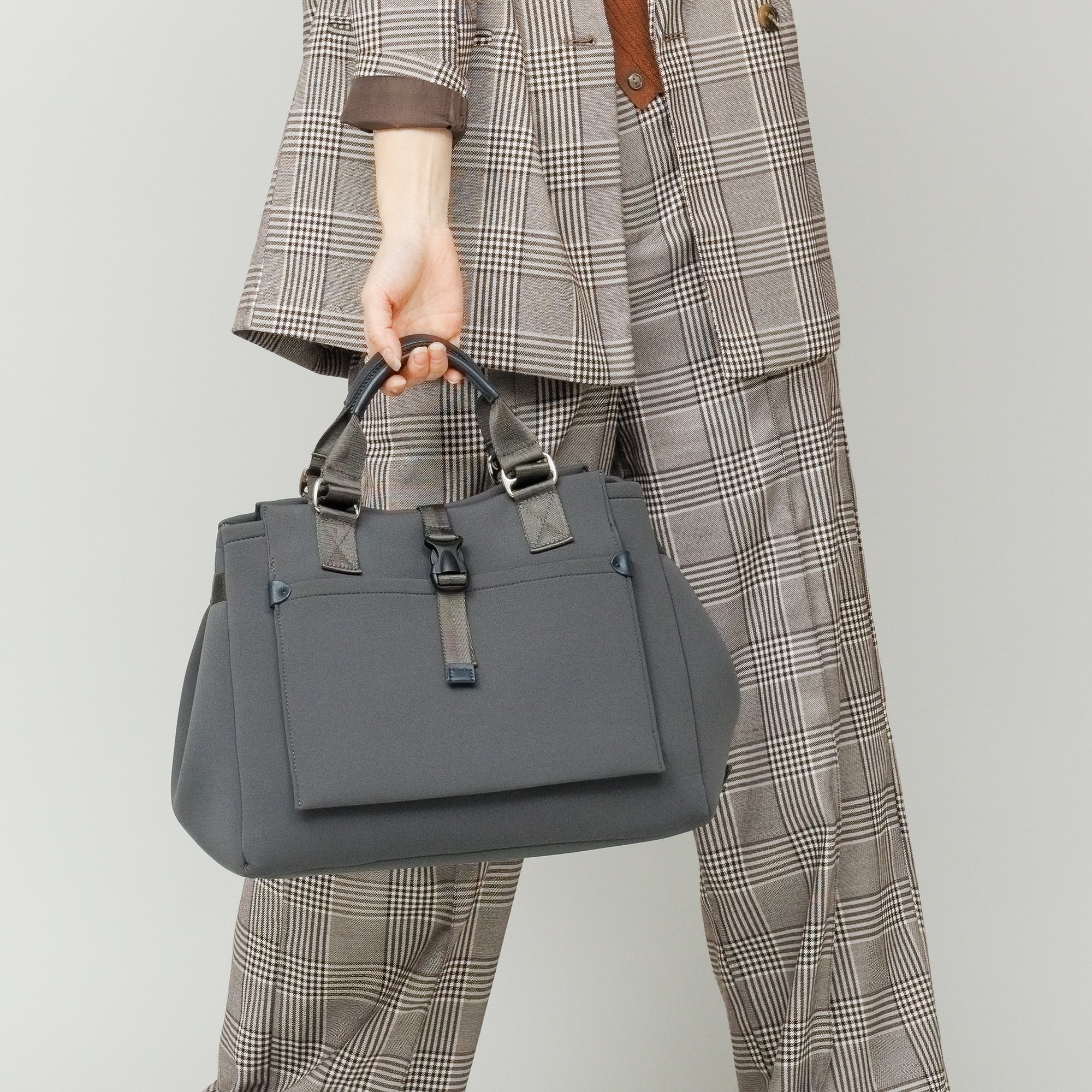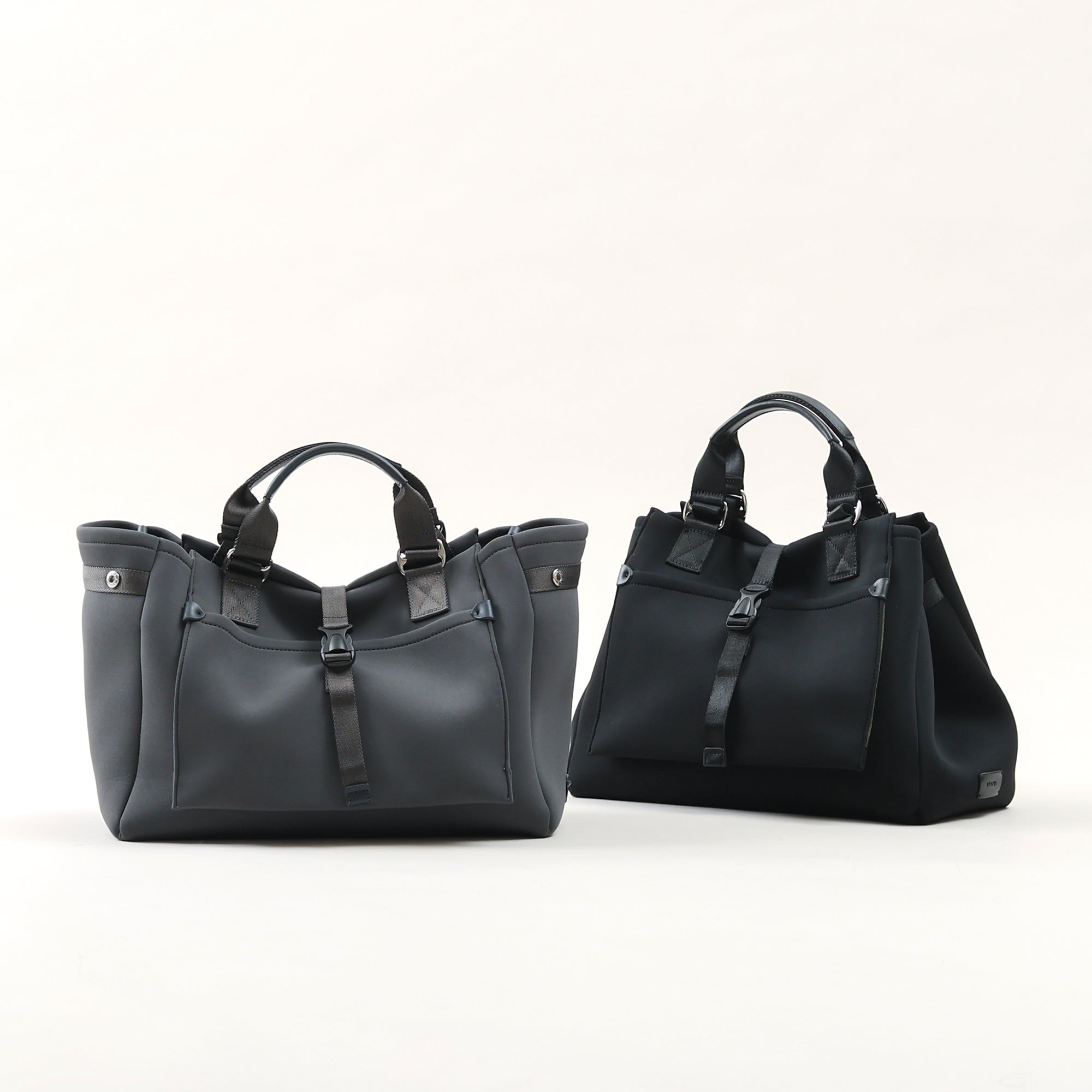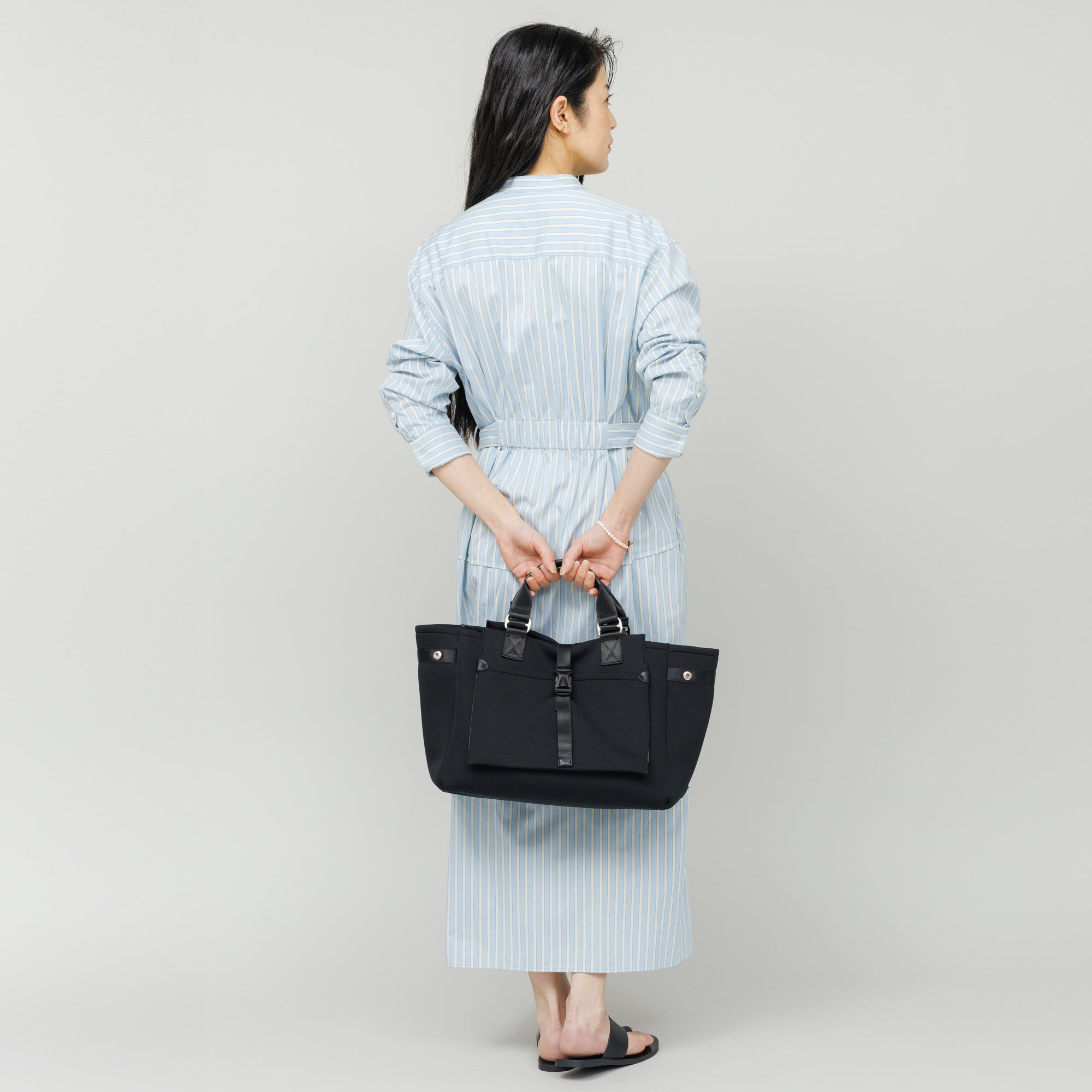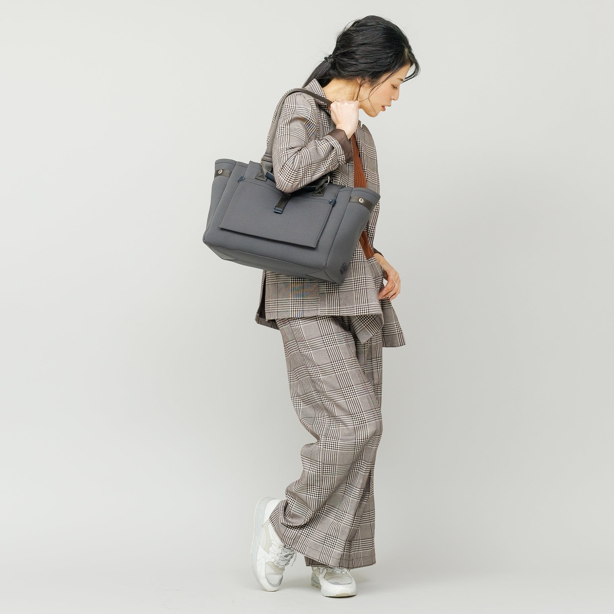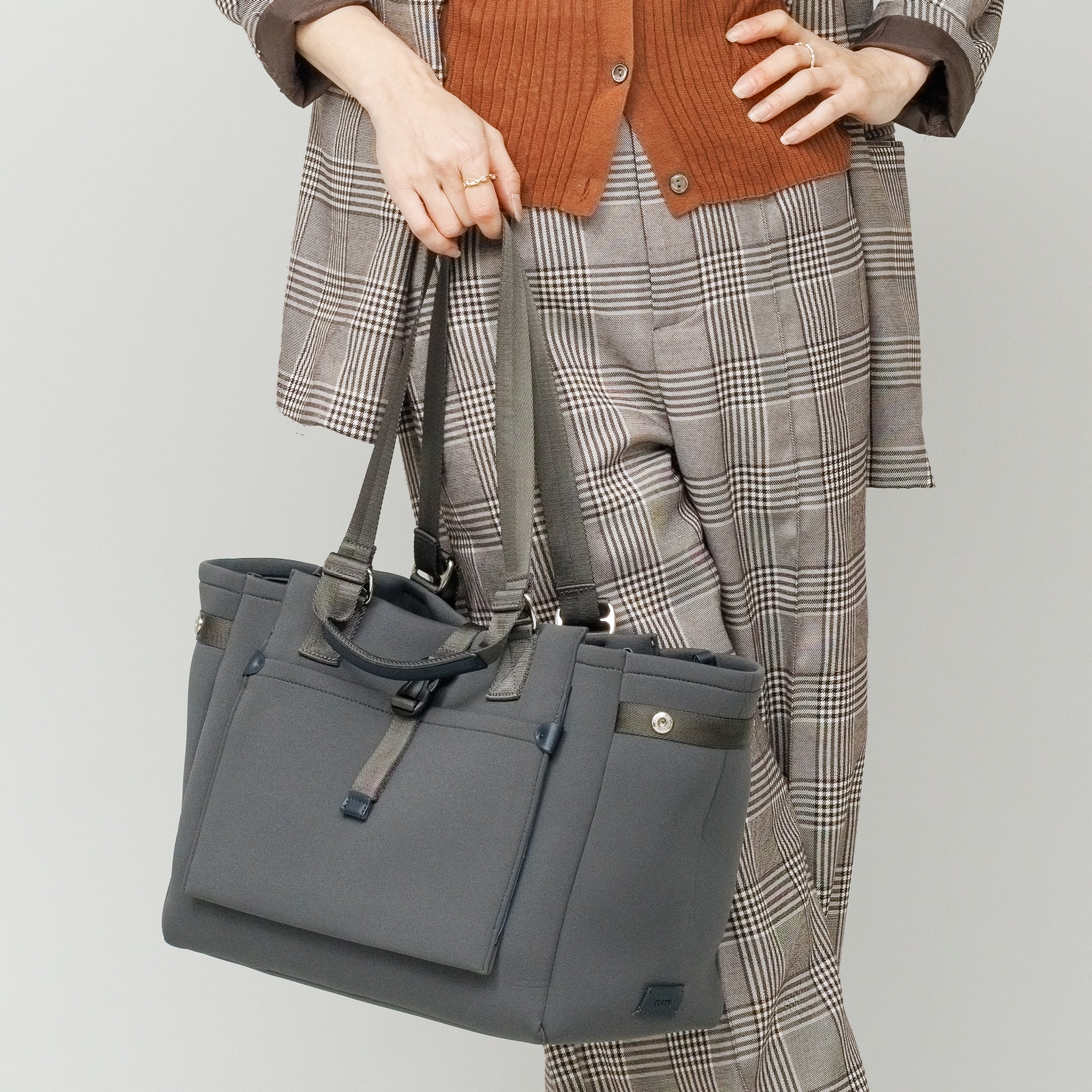カジュアルなディテールながらも全体の色味を抑えることで都会的な雰囲気に仕上げたトートバッグ。