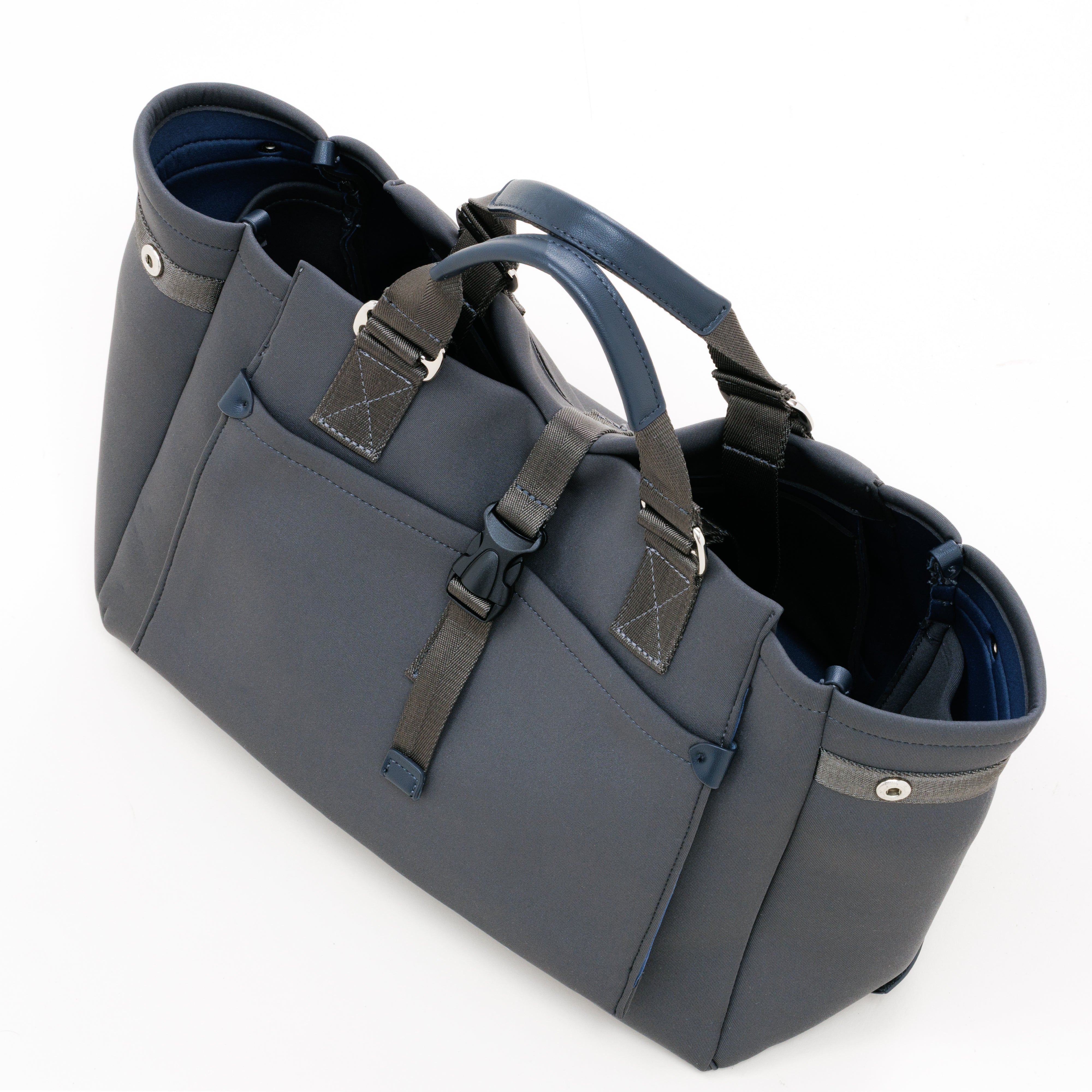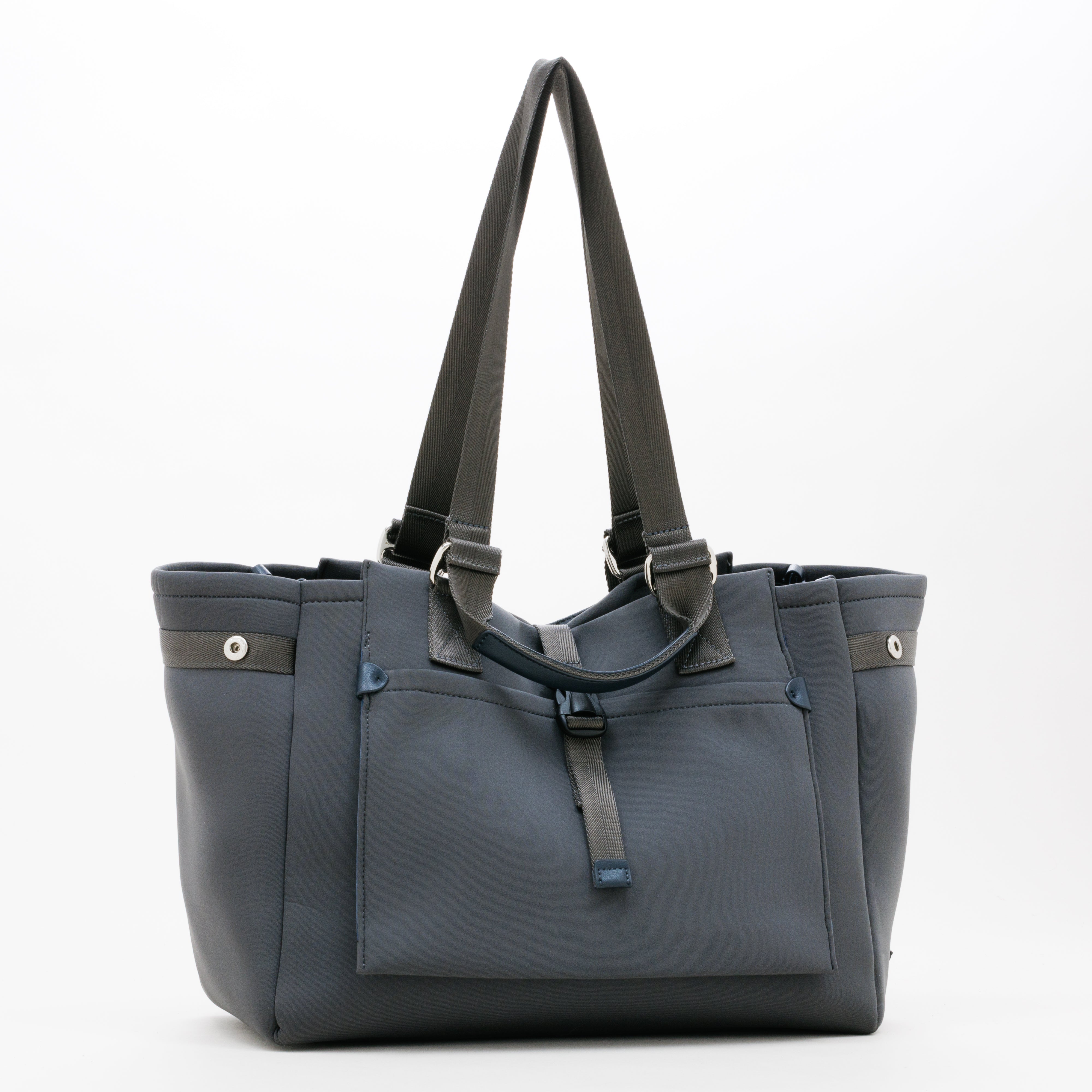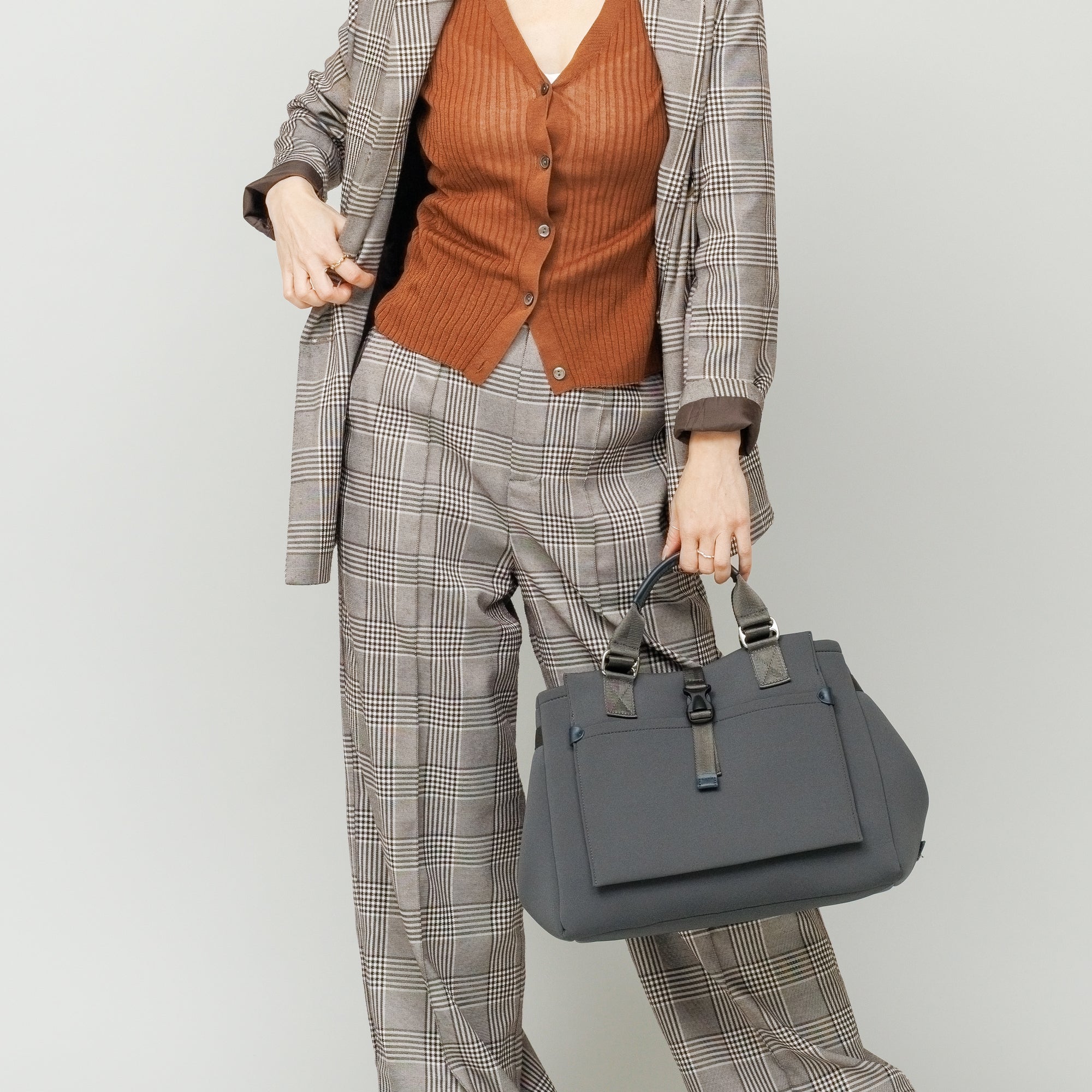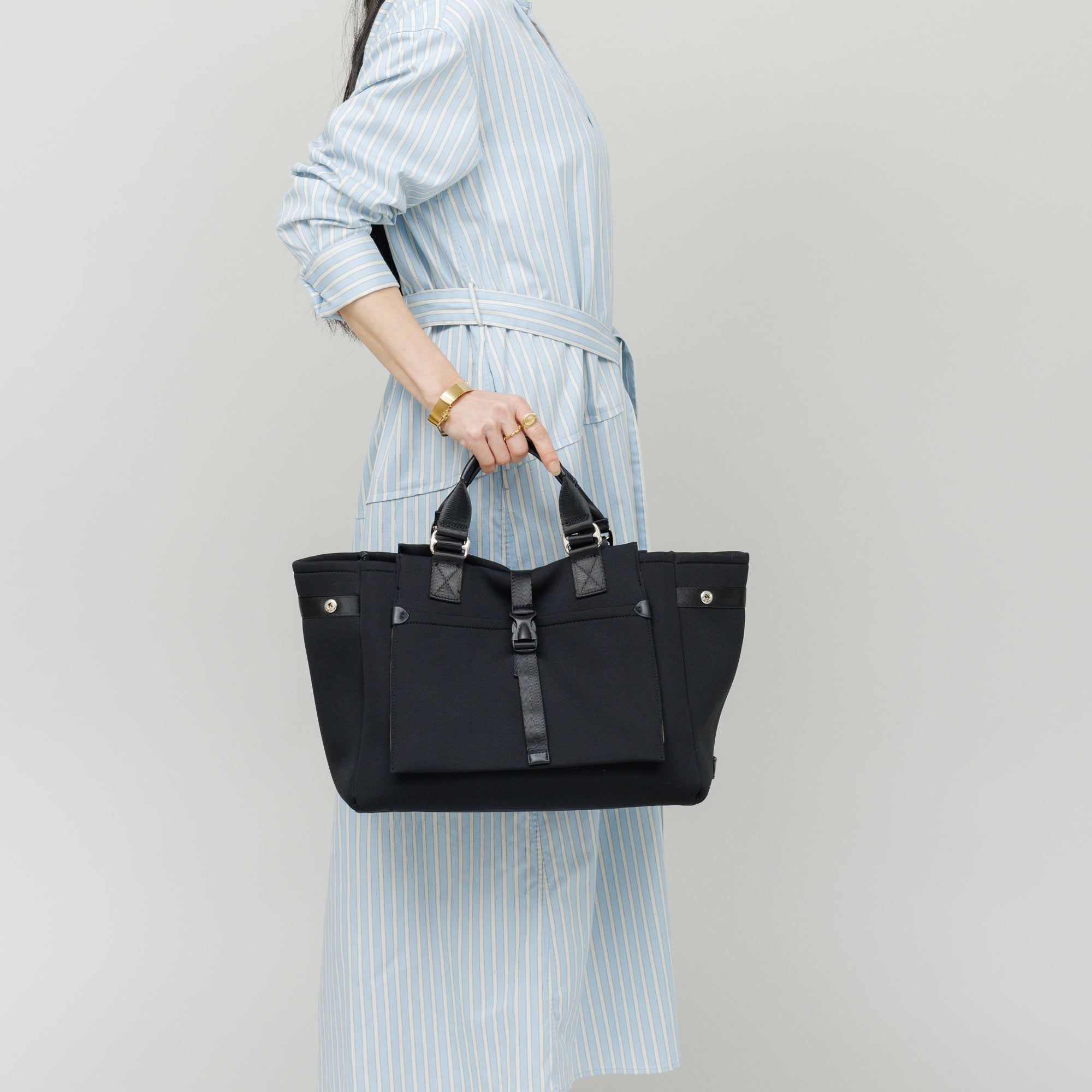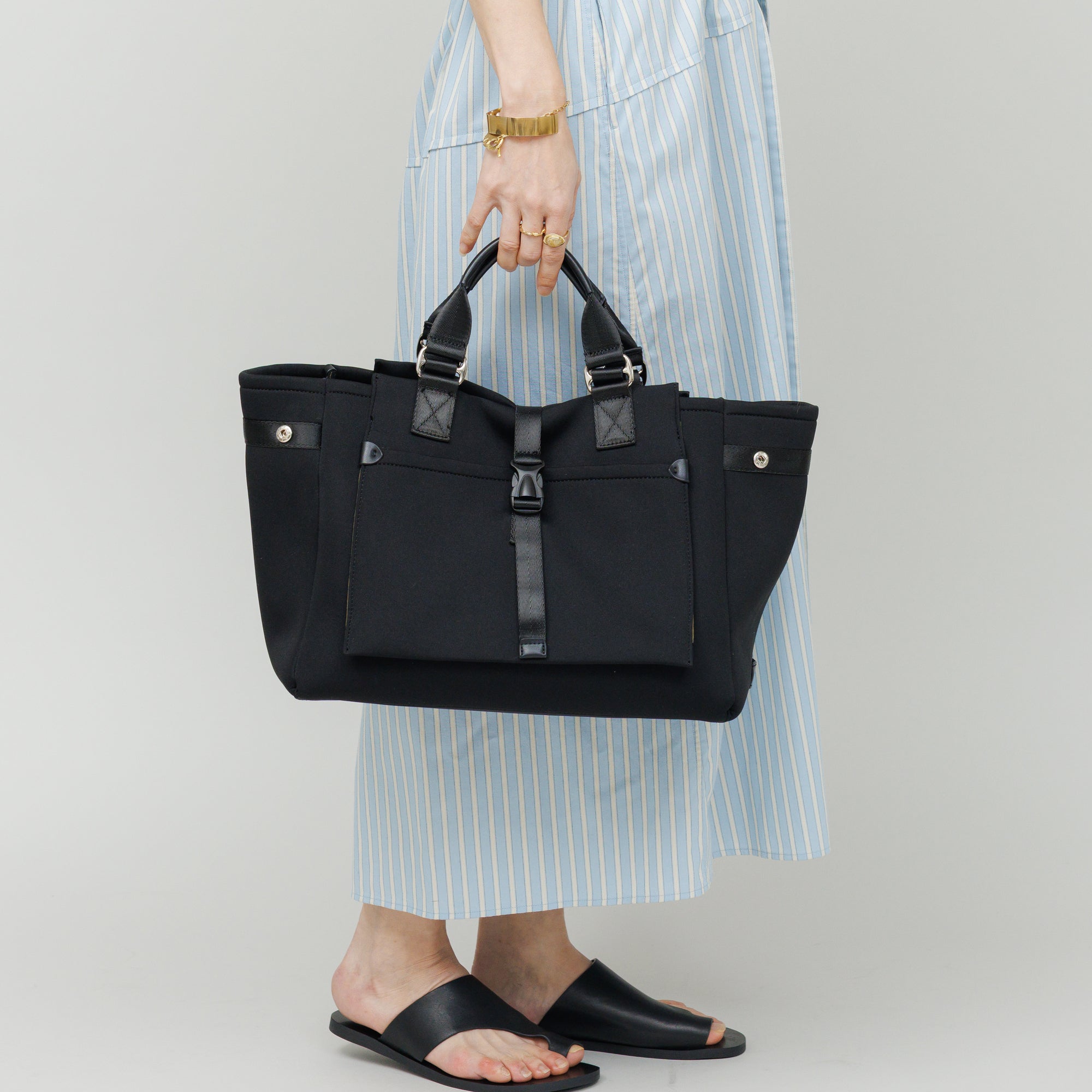 カジュアルなディテールながらも全体の色味を抑えることで都会的な雰囲気に仕上げたトートバッグ。